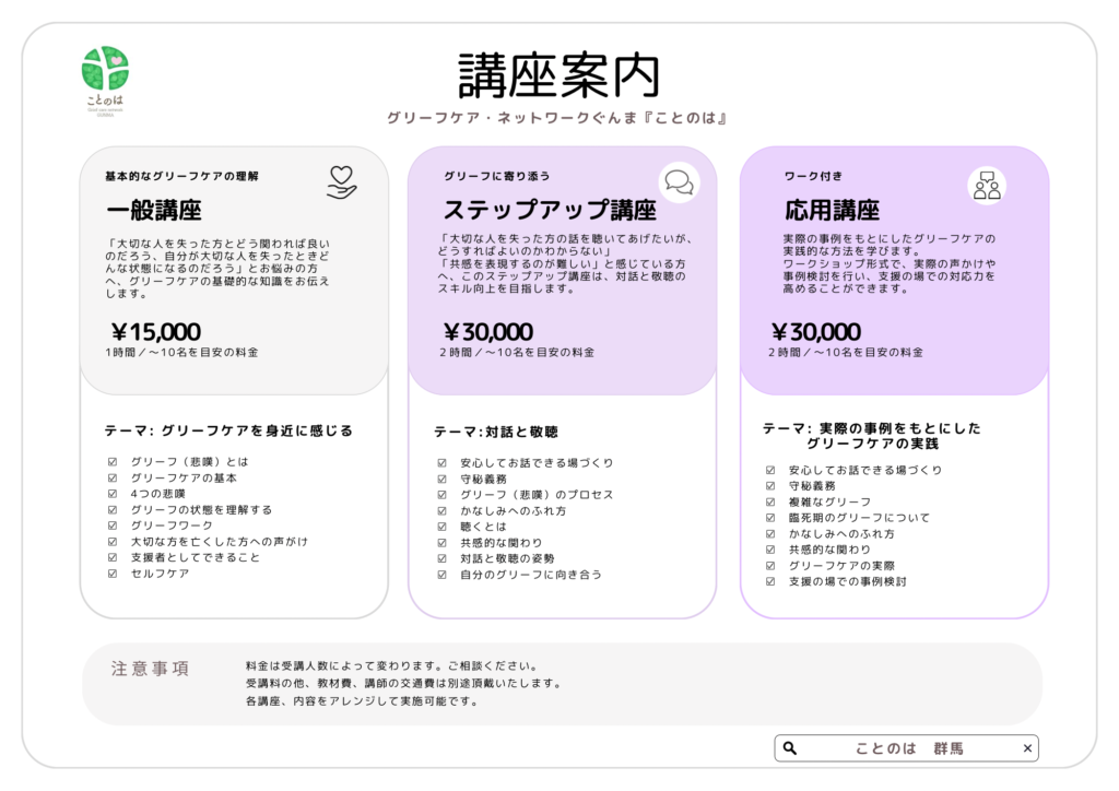 『グリーフケア・ネットワークぐんま ことのは』では「グリーフ」・「グリーフケア」とはどんなことか、大切さを知り学ぶ機会をつくっています。